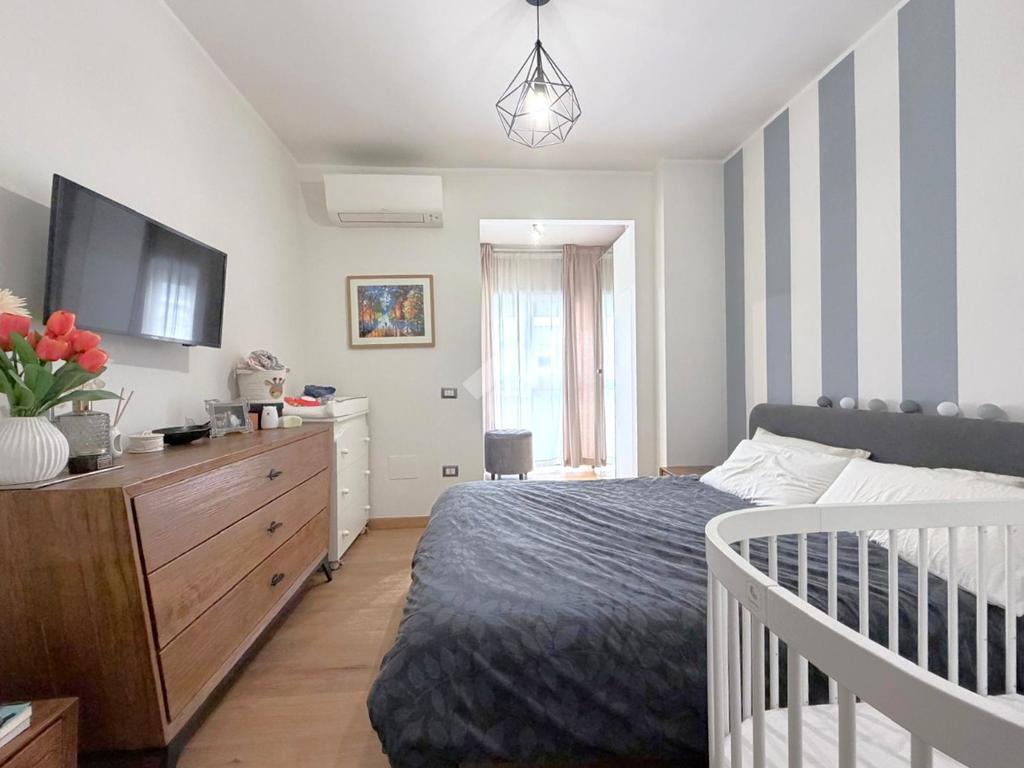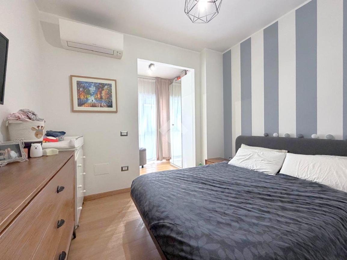 La zona notte è composta da una camera matrimoniale ampia, dotata di cabina armadio, soluzione comoda e ricercata che valorizza ulteriormente l’abitazione.