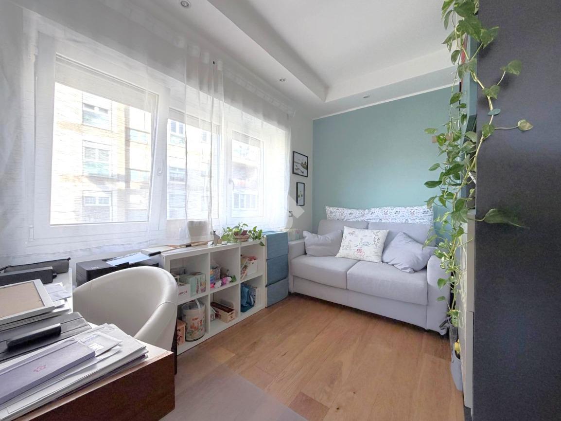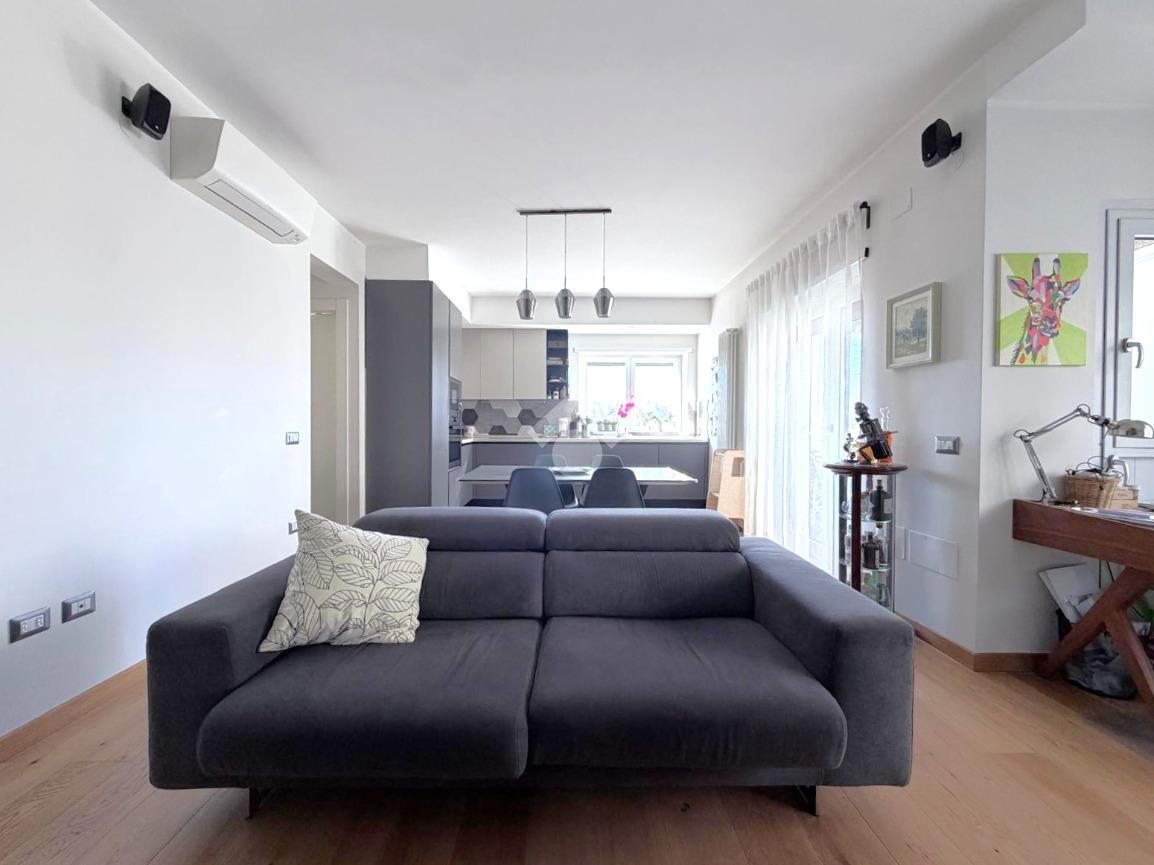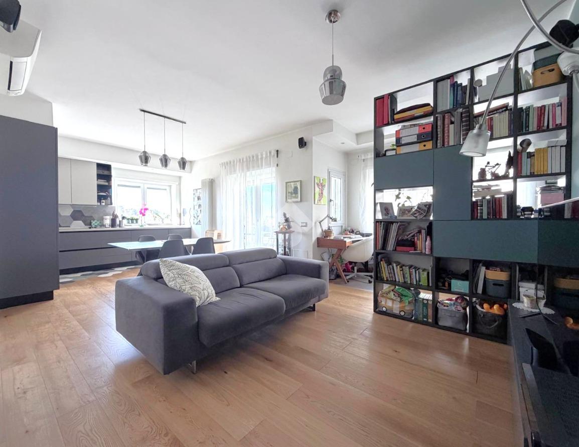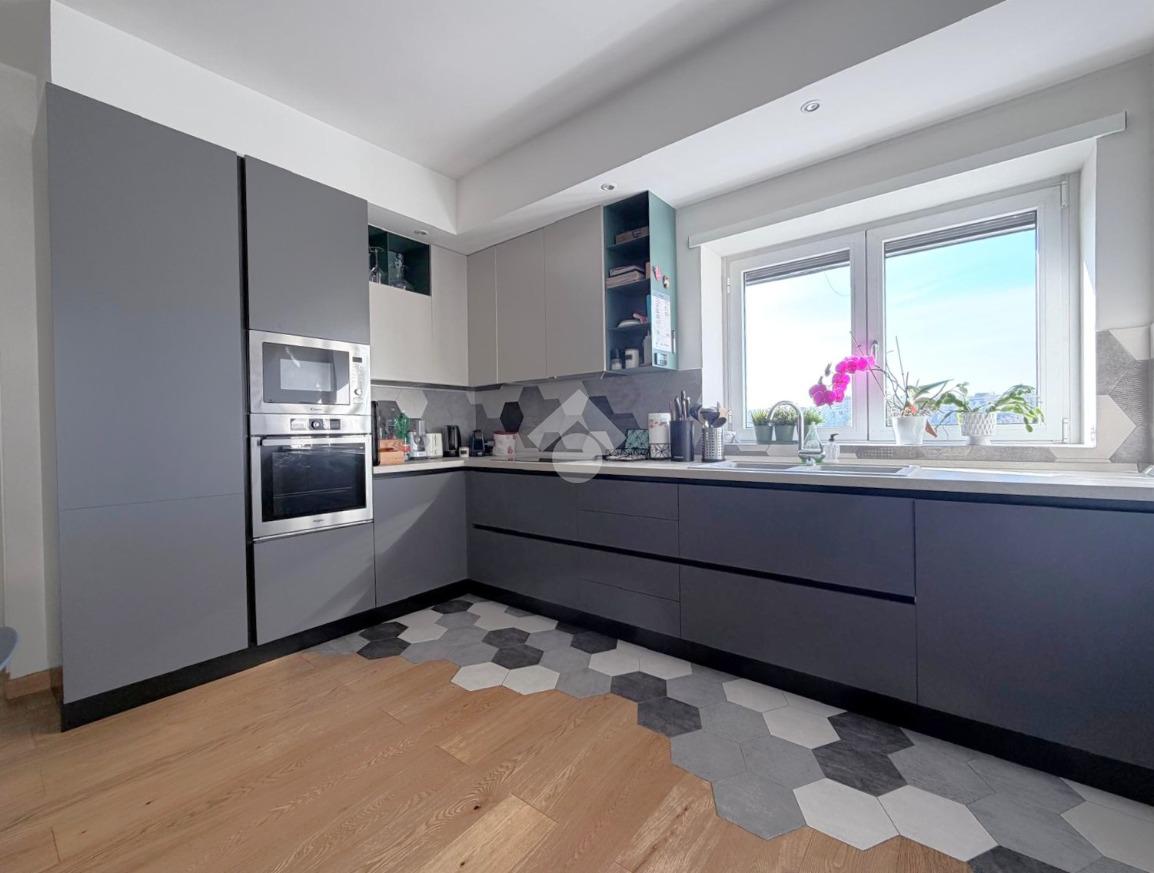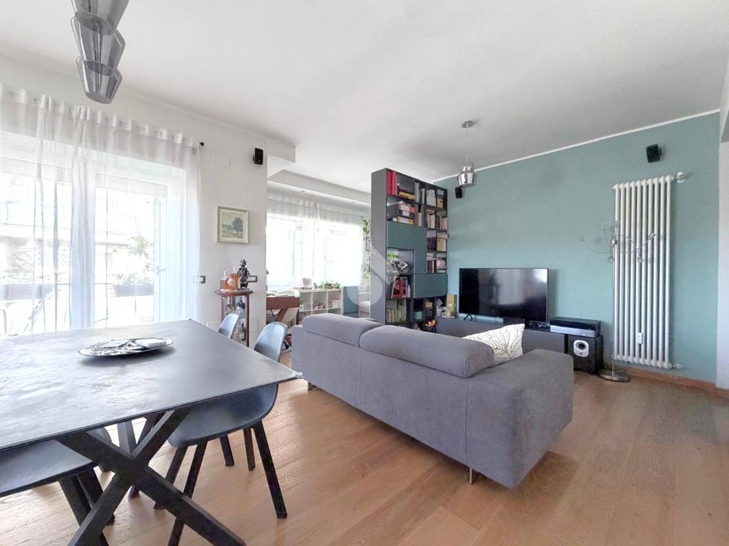 Dal salone si accede al terrazzo vivibile, vero punto di forza dell’immobile, con vista panoramica sul Parco delle Valli, una caratteristica rara che garantisce luminosità, privacy e una vista suggestiva in ogni momento della giornata.